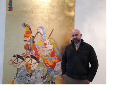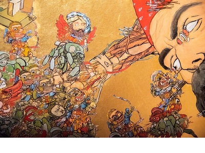 Ο Κωνσταντίνος Παπαμιχαλόπουλος με διδακτορικό από το Τμήμα Επικοινωνίας, Μέσων και Πολιτισμού του Παντείου Πανεπιστημίου και σπουδές στην ΑΣΚΤ, διδάσκει ζωγραφική και χαρακτική στο Τμήμα Εικαστικών Τεχνών του Πανεπιστημίου Ιωαννίνων. Η τωρινή του δουλειά που συμπίπτει με την επέτειο των 200 χρόνων από την Ελληνική Επανάσταση, «μιξάρει» ευρηματικά τις επιρροές της επιστημονικής φαντασίας και των βιντεοπαιχνιδιών με τις λαικές τέχνες της ανατολής και της Δύσης. Οι ήρωες του ’21 που μάθαμε στο σχολείο με τα γνώριμα «ναίφ» πρόσωπα φαντάζουν ως ψηφιακοί σαμουράι σε χρυσό σκηνικό!