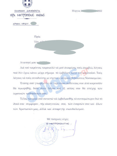 Με μια αυστηρή επιστολή ο Μητροπολίτης Ηλείας κ.κ Γερμανός καλεί τους ανεμβολίαστους Ιερείς της Μητρόπολης Ηλείας να του δηλώσουν το λόγο που παραμένουν ανεμβολίαστοι και μάλιστα να τεκμηριώσουν τη θέση τους με Ιατρικές αποδείξεις.