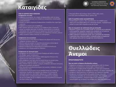 Για περισσότερες πληροφορίες και οδηγίες αυτοπροστασίας από τα έντονα καιρικά φαινόμενα, οι πολίτες μπορούν να επισκεφθούν την ιστοσελίδα της Γενικής Γραμματείας Πολιτικής Προστασίας στην ηλεκτρονική διεύθυνση www.civilprotection.gr.