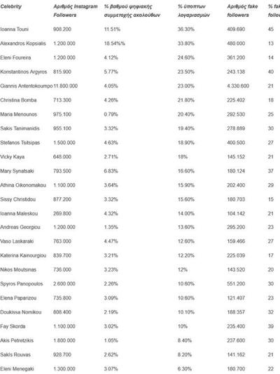 Iωάννα Τούνη, Κωνσταντίνος Αργυρός, Δούκισσα Νομικού, Σάκης Τανιμανίδης, Αθηνά Οικονομάκου και Σάκης Ρουβάς είναι μερικοί από τους Έλληνες influencers που έχουν τους περισσότερους fake followers.