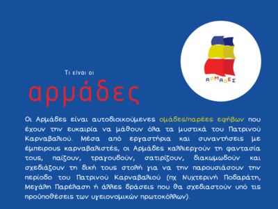 Αναλυτικότερα, οι «Αρμάδες» είναι αυτοδιοικούμενες ομάδες/παρέες εφήβων (13-17 ετών) που έχουν την ευκαιρία μέσα από εργαστήρια και συναντήσεις με έμπειρους καρναβαλιστές, να καλλιεργήσουν τη φαντασία τους, να παίξουν, να τραγουδήσουν, να σατιρίσουν, να διακωμωδήσουν και να σχεδιάσουν τη δική τους στολή για να την παρουσιάσουν την περίοδο του Πατρινού Καρναβαλιού (πχ Νυχτερινή Ποδαράτη, Μεγάλη Παρέλαση ή άλλες δράσεις που θα σχεδιαστούν με τα ισχύοντα υγειονομικά πρωτόκολλα).