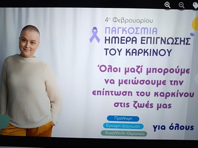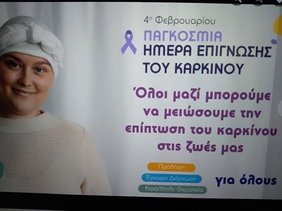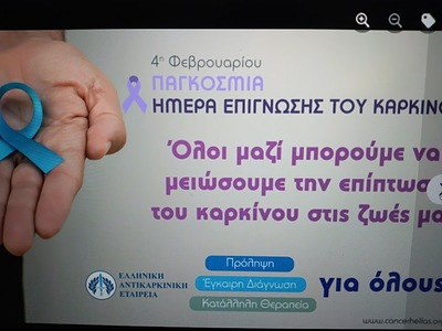 Η 4η Φεβρουαρίου είναι Παγκόσμια Ημέρα Επίγνωσης του καρκίνου. Αυτό αναφέρει στο μήνυμα της η Ελληνική Αντικαρκινική Εταιρεία υπογραμμίζοντας πως όλοι μαζί μπορούμε να μειώσουμε την επίπτωση του καρκίνου στις ζωές μας. Χρειάζεται Πρόληψη, έγκαιρη διάγνωση και κατάλληλη θεραπεία για όλους.
