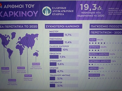 Σύμφωνα με πίνακα με στοιχεία της Ελληνικής Αντικαρκινικής Εταιρείας, το 2020, 19,3 εκατ. ήταν παγκόσμια τα νέα περιστατικά καρκίνου με την Ασία να κατέχει τα πρωτεία σε ποσοστό 49,3% και δεύτερη την Ευρώπη με 22,8%.