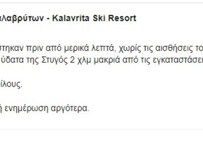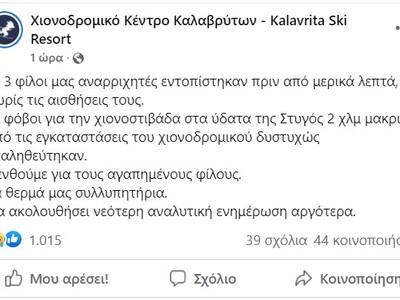 Οι φόβοι για την χιονοστιβάδα στα ύδατα της Στυγός 2 χλμ μακριά από τις εγκαταστάσεις του χιονοδρομικού δυστυχώς επαληθεύτηκαν" αναφέρεται σε ανακοίνωση του Χιονοδρομικού Κέντρου Καλαβρύτων. "Πενθούμε για τους αγαπημένους φίλους. Τα θερμά μας συλλυπητήρια. Θα ακολουθήσει νεότερη αναλυτική ενημέρωση αργότερα".