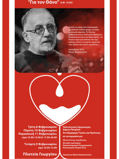Ξεκινά αύριο Τρίτη 8 Φεβρουαρίου στην πλατεία Γεωργίου η τετραήμερη αιμοδοσία που διοργανώνουν για τρίτη κατά σειρά χρονιά στη μνήμη του μεγάλου πατρινού συνθέτη Θάνου Μικρούτσικου, ο Πολιτιστικός Οργανισμός του Δήμου Πατρέων και η αντιδημαρχία Υγείας Πρόνοιας, σε συνεργασία με την οικογένεια του, το Εθνικό Κέντρο Αιμοδοσίας και τη Μονάδα Αιμοληψίας του Πανεπιστημιακού Περιφερειακού Νοσοκομείο Ρίου.