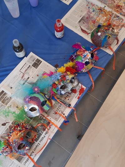 Μέσα σε καρναβαλικό κλίμα και σε ευχάριστη ατμόσφαιρα με πολλή καρναβαλική μουσική στην αίθουσα των εργαστηρίων ΝΚ2 των Παλαιών Σφαγείων τα παιδιά υπό τις οδηγίες της Όλγας Μοσχόβου και της Βασιλικής Κασπίρη έμαθαν για την κατασκευή καρναβαλικών μασκών και κατασκεύασαν από κοινού με τις εκπαιδεύτριες τις δικές τους καρναβαλικές μάσκες.