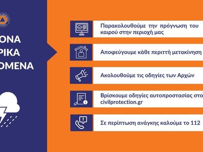Για περισσότερες πληροφορίες και οδηγίες αυτοπροστασίας από τα έντονα καιρικά φαινόμενα, οι πολίτες μπορούν να επισκεφθούν την ιστοσελίδατης Γενικής Γραμματείας Πολιτικής Προστασίας στην ηλεκτρονική διεύθυνση www.civilprotection.gr.