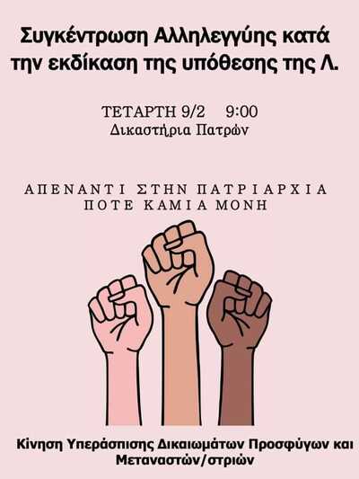 Την αλληλεγγύη τους στην υποθεση της Λ. από την Πάτρα, θύμα ενδοοικογενειακής βίας, θα εκδηλώσουν την Τετάρτη 9 Φεβρουαρίου τα μέλη της Κίνησης Υπεράσπισης Δικαιωμάτων Προσφύγων και Μεταναστών/στριών έξω από τα δικαστήρια της Πάτρας όπου συζητώνται τα ασφαλιστικά μέτρα.