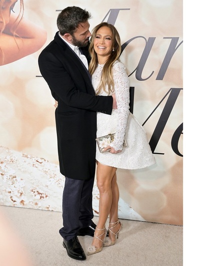 Η πολύκροτη επανασύνδεση της 52χρονης λατίνας ντίβας Τζένιφερ Λόπεζ και του 49χρονου ηθοποιού και σκηνοθέτη ΜπενΑφλεκ παραμένει «καυτή» και οι διαχυτικότητες του ειδυλλίου πρωταγωνίστησαν στην επίσημη πρεμιέρα της αισθηματικής κομεντί «Marry me» που βγαίνει αυτές τις μέρες παγκοσμίως στα σινεμά. H J Lo όπως πάντα αγέραστη και super trendy, ξεσήκωσε καταιγιστικά φλας ως πρωταγωνίστρια το βράδυ της Τρίτης στο Λος Αντζελες, έχοντας στο πλευρό της τον αγαπημένο της. Αγκαλιές, γλυκόλογα, χαμόγελα και φιλιά και πάλι μπροστά στο φακό ώστε ο συμπρωταγωνιστής της Λόπεζ, ο τραγουδιστής Μαλούμα να παραμένει σε δεύτερο πλάνο. Λόγω θεματικής της ταινίας η star της εκδήλωσης ήταν ντυμένη στα λευκά. Επέλεξε ένα φόρεμα από λευκή δαντέλα Gianbattista Valli με πολύ περίτεχνα αξεσουάρ. τσαντάκι Dolce e Gabbana και γοβάκια Jimmy Choo. Το ασύμμετρο στρίφωμα και το μίνι που θα δεσπόσει στη μόδα της άνοιξης άρεσαν πολύ στις fashion στήλες. Το μακιγιάζ ήταν σε nude τόνους ενώ τα highlights στα μαλλιά έχουν ξανθύνει κι άλλο.
