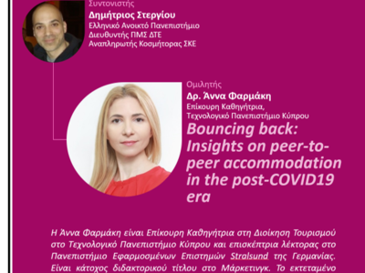 Προσκεκλημένη ομιλήτρια είναι η Δρ. Άννα Φαρμάκη, Επίκουρη Καθηγήτρια στη Διοίκηση Τουρισμού στο Τεχνολογικό Πανεπιστήμιο Κύπρου και Επισκέπτρια Λέκτορας στο Πανεπιστήμιο Εφαρμοσμένων Επιστημών Stralsund της Γερμανίας.