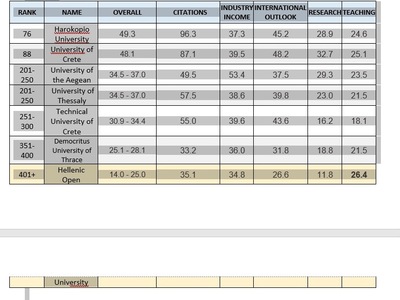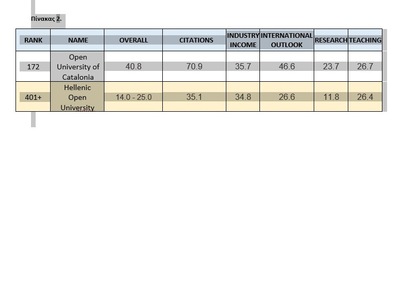 Η κατάταξη του 2022 περιλαμβάνει 539 Πανεπιστήμια (από 475 το 2021) και άλλα 251 Ιδρύματα τα οποία αναφέρονται με την ορολογία “reporter”. Το Ελληνικό Ανοικτό Πανεπιστήμιο καταλαμβάνει τη θέση 401+. Στη διεθνή κατάταξη του 2022 περιλαμβάνονται συνολικά επτά (7) Ελληνικά Πανεπιστήμια μεταξύ των οποίων το Ελληνικό Ανοικτό Πανεπιστήμιο καταλαμβάνει την υψηλότερη βαθμολογία στην «διδασκαλία» (Πίνακας 1). Όσον αφορά στην κατάταξη των Ανοικτών Πανεπιστημίων παγκοσμίως το Open University of Catalonia βρίσκεται στην πρώτη θέση και το ΕΑΠ στη δεύτερη θέση (Πίνακας 2).