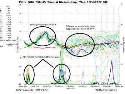 Χαρακτηριστικό το παρακάτω διάγραμμα ensemble για την πόλη της Πάτρας, όπου φαίνεται ο μέσος όρος των σεναρίων των προγνωστικών μοντέλων.
