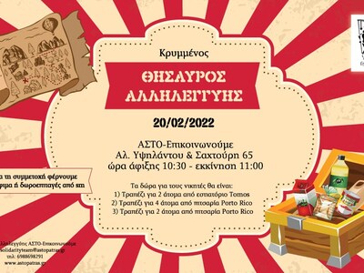 Την Κυριακή 20 Φεβρουαρίου από τις 10.30 έως τις 13.30 ντυνόμαστε Ναύαρχοι και ερχόμαστε στον Α.Σ.Τ.Ο. – Επικοινωνούμε στην οδό Αλ. Υψηλάντου & Σαχτούρη 65, να βρούμε τον Κρυμμένο Θησαυρό μέσα από γρίφους και παιχνίδι για μικρούς και μεγάλους.