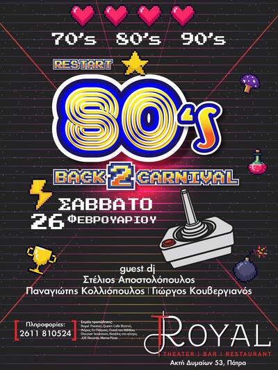 Ένα από τα πιο αναμενόμενα καρναβαλικά και original classic parties, το 80’s back to carnival κάνει Restart… απόψε, Σάββατο 26 Φεβρουαρίου 2022, πάει πίσω στο χρόνο και γεμίζει με μελωδίες από τις δεκαετίες των ’70’s, 80’s και 90’s προσεκτικά επιλεγμένες από τους μετρ του είδους.