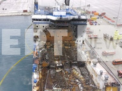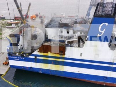 Το πλοίο «Euroferry Olympia», που έπιασε φωτιά τα ξημερώματα της 18ης Φεβρουαρίου κοντά στην Κέρκυρα, βρίσκεται αγκυροβολημένο στο λιμάνι του Πλατυγιαλίου στην Αιτωλοακαρνανία, με τα συνεργεία διάσωσης για ακόμη μια ημέρα να προσπαθούν να ξεμπλοκάρουν την μπουκαπόρτα.
