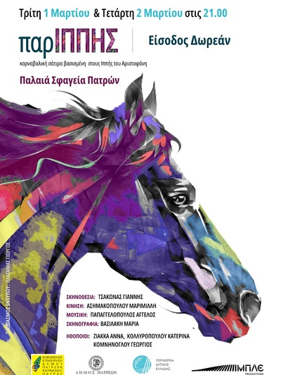 Απόψε Τρίτη 1η και την Τετάρτη 2 Μαρτίου 2022 στις 21:00 στα Παλαιά Σφαγεία (αίθουσα Καρναβαλιού) παρουσιάζεται η παράσταση «παρΙΠΠΗΣ» σε σκηνοθεσία του Γιάννη Τσάκωνα με είσοδο ελεύθερη για το κοινό.