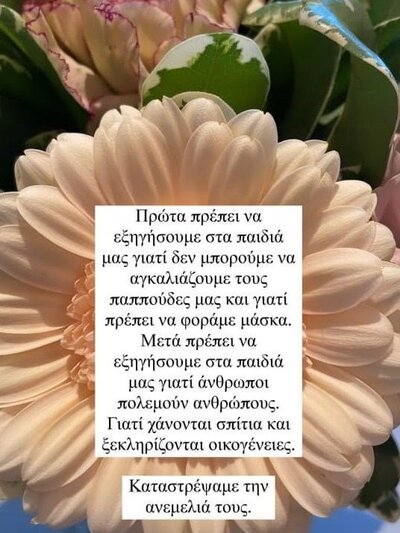 “Πρώτα πρέπει να εξηγήσουμε στα παιδιά μας γιατί δεν μπορούμε να αγκαλιάζουμε τους παππούδες μας και γιατί πρέπει να φοράμε μάσκα. Μετά πρέπει να εξηγήσουμε στα παιδιά μας γιατί άνθρωποι πολεμούν ανθρώπους. Γιατί χάνονται σπίτια και ξεκληρίζονται οικογένειες. Καταστρέψαμε την ανεμελιά τους”, έγραψε στο Instagram η Δούκισσα Νομικού, η οποία είναι μητέρα δύο παιδιών, του Σάββα και της Αναστασίας.
