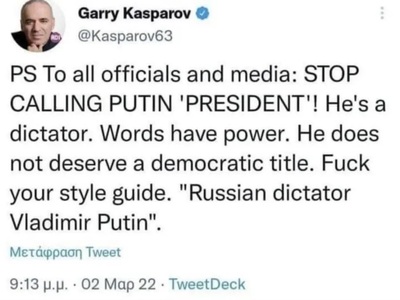 Εξοργισμένος εναντίον του Βλαντιμίρ Πούτιν είναι ο πρωταθλητής στο σκάκι, Γκάρι Κασπάροφ, ο οποίος σε ανάρτηση του στο twitter εξαπολύει ευθεία επίθεση εναντίον του. Όπως λέει απευθυνόμενος σε δημοσιογράφους αλλά και αξιωματούχος πρέπει να σταματήσουν να αποκαλούν τον Πουτιν πρόεδρο.