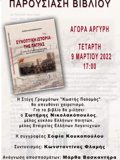 Η δημοσιογράφος και συγγραφέας Σοφία Καυκοπούλου παρουσιάζει το νέο της βιβλίο την Τετάρτη 10 Μαρτίου στις 5 το απόγευμα στην “Αγορά Αργύρη”. Το βιβλίο της Σοφίας Καυκοπούλου “Συνοπτική ιστορία της Πάτρας κατά τη βυζαντινή περίοδο και τη φραγκοκρατία” είναι ένα ιστορικό πόνημα το οποίο παρουσιάζει σημαντικές πτυχές της ιστορίας της πόλης εκείνη την “άγνωστη” για πολλούς περίοδο.