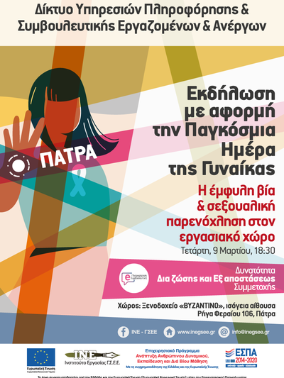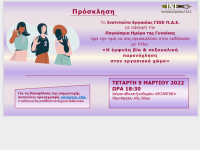 Το Ινστιτούτο Εργασίας της Γ.Σ.Ε.Ε. Περιφέρειας Δυτικής Ελλάδας διοργανώνει εκδήλωση με φυσική παρουσία και ταυτόχρονα δυνατότητα διαδικτυακής μετάδοσης με θέμα «Η έμφυλη βία & σεξουαλική παρενόχληση στον εργασιακό χώρο» που θα πραγματοποιηθεί την Τετάρτη 9 Μαρτίου 2022 στις 18:30 στο ξενοδοχείο «Βυζαντινό», στην ισόγεια αίθουσα, στην Ρήγα Φεραίου 106, στην Πάτρα.