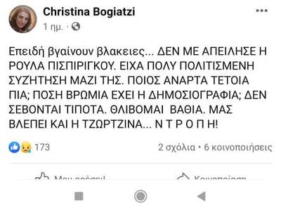 Η παιδοψυχολόγος-λογοπαθολογος Χριστίνα Μπογιατζή διαψεύδει με ανάρτηση της στα σόσιαλ μίντια δημοσίευμα που ανέφερε ότι την απείλησε η Ρούλα Πισπιρίγκου, μετά την ανάλυση της ζωγραφιάς της 9χρονης Τζωρτζίνας.