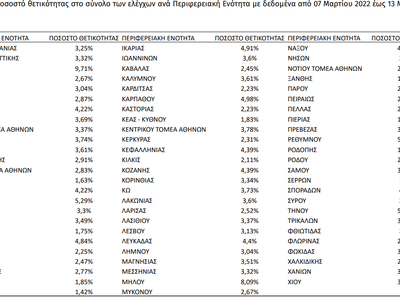 Σύμφωνα με τη σημερινή έκθεση του ΕΟΔΥ, την εβδομάδα 07 Μαρτίου 2022 - 13 Μαρτίου 2022 (W10), το ποσοστό θετικότητας ήταν 7.24% σε σύνολο 1.790.954 εργαστηριακών ελέγχων (RT-PCR/Rapid-Ag) και 1.55% σε σύνολο 2.567.295 αυτοδιαγνωστικών ελέγχων. Στο σύνολο των ελέγχων, το ποσοστό θετικότητας ήταν 3.02%.