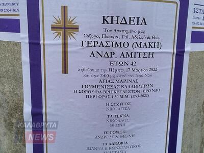 Έφυγε ξαφνικά από τη ζωή στα 42 χρόνια του ο Γεράσιμος Αμίτσης βυθίζοντας στο πένθος τα Καλάβρυτα. Ο εκλιπών ήταν πατέρας δύο ανήλικων παιδιών, από την Γουμένισσα Καλαβρύτων. Ήταν ένας αγαπητός σε όλους νέος και ο θανατός του προξένησε μεγάλη θλίψη. Η κηδεία του θα τελεστεί στον Ιερό Ναό Αγίας Μαρίνας Γουμένισσας σήμερα Πέμπτη 17 Μαρτίου στις 13:30.