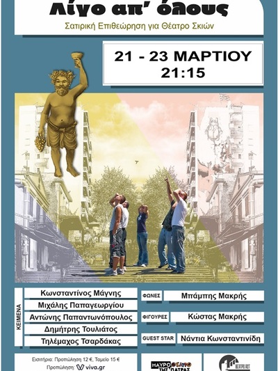Η πρωτότυπη σατιρική επιθεώρηση για θέατρο Σκιών, με τίτλο «Λίγο Απ' όλους» θα παρουσιαστεί στο Θέατρο Act, στο πάνω μέρος στις σκάλες Γεροκωστοπούλου, στην Πάτρα για 3 μόνο παραστάσεις από Δευτέρα 21 μέχρι και την Τετάρτη 23 Μαρτίου 2022.