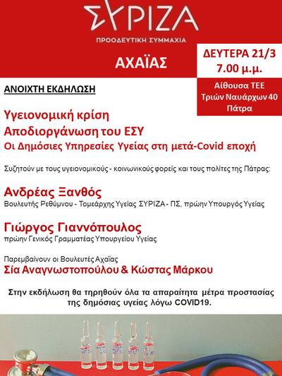 Η Νομαρχιακή Επιτροπή Αχαΐας του ΣΥΡΙΖΑ – Προοδευτική Συμμαχία διοργανώνει την Δευτέρα 21η Μαρτίου 2022 στις 19.00 στην ισόγεια αίθουσα του Τεχνικού Επιμελητηρίου Ελλάδας - Τμήμα Δυτικής Ελλάδας, στην Τριών Ναυάρχων 40 στην Πάτρα, μία ανοιχτή, δια ζώσης εκδήλωση - συζήτηση με θέμα: «Υγειονομική Κρίση – Αποδιοργάνωση του ΕΣΥ - Οι δημόσιες υπηρεσίες Υγείας στη μετα–COVID εποχή».