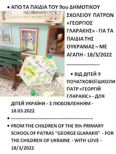 Δέματα αγάπης με τρόφιμα παραδόθηκαν χθες στον Πρόεδρο του Συλλόγου Ελληνοουκρανικής Φιλίας ο Φάρος , Μιχάλη Ροδόποουλο, από τους μαθητές της Ε και ΣΤ τάξης του 9ου Δημοτικού Σχολείου Πατρών ΣΣ Γλαράκη.