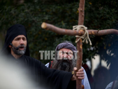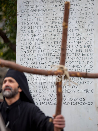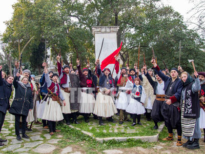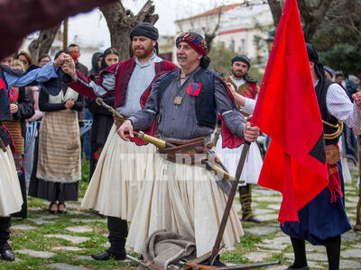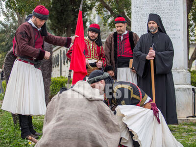Σκηνές από την αναπαράσταση της ορκωμοσίας των Αγωνιστών της Πάτρας τον Μάρτιο του 1821 στην πλατεία Αγίου Γεωργίου παρουσίασαν χθες οι "Μωραΐτες εν χορώ" στην Άνω Πόλη της Πάτρας.