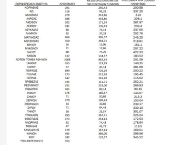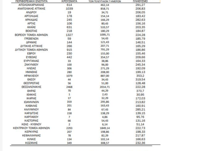 Από τα στοιχεία του ΕΟΔΥ προκύπτει πως από τα συνολικά 23.529 κρούσματα του τελευταίου 24ώρου, τα 7.045 εντοπίστηκαν στην Αττική, τα 2.468 στη Θεσσαλονίκη, ενώ τα 1.079 στο Ηράκλειο.