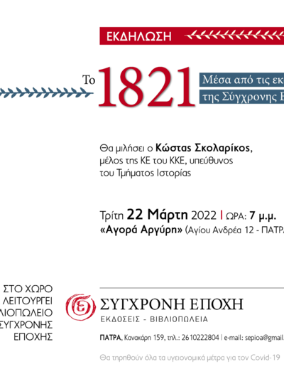 Εκδήλωση με θέμα «Το 1821 μέσα από τις εκδόσεις της "Σύγχρονης Εποχής"» θα πραγματοποιηθεί την Τρίτη 22 Μάρτη 2022 στις 7 μ.μ. στην «Αγορά Αργύρη» στην Πάτρα στην οδό Αγίου Ανδρέου 12, από τον εκδοτικό οίκο της Σύγχρονης Εποχής.