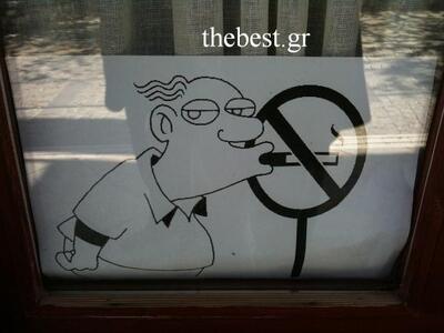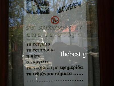 Μπορεί η κυβέρνηση και το αρμόδιο Υπουργείο να εξαγγέλλει βελτιώσεις και τροποποιήσεις για τον αντικαπνιστικό νόμο, που επί της ουσίας και παρά τις περί του αντιθέτου κορώνες Λοβερδου δεν εφαρμόστηκε ποτέ, οι Έλληνες όμως και μάλιστα οι Καλαβρυτινοί αντιμετωπίζουν το όλο ζήτημα με δικές τους εξαγγελίες για επί πλέον απαγορεύσεις, αλλά πάνω από όλα με χιούμορ. Ο ιδιοκτήτης της γραφικής ταβέρνας στο κέντρο των Καλαβρύτων, ανήρτησε στην είσοδο της αυτοσχέδια πινακίδα, με τις δικές του επί πλέον απαγορεύσεις για το κάπνισμα.