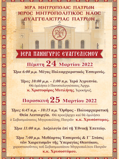 Η θρησκευτική πανήγυρη στον ιστορικό Μητροπολιτικό ναό της Ευαγγελίστριας περιλαμβάνει στις 6 το απόγευμα της Πέμπτης 24/3/2022, μέγα πολυαρχιερατικό εσπερινό μετ’ αρτοκλασίας ενώ θα ακολουθήσει στις 10 το βράδυ ιερά αγρυπνία όπου και θα μιλήσει ο πανοσιολογιότατος αρχιμανδρίτης π. Χριστοφόρος Μυτιλήνης, ιεροκήρυκας της Μητροπόλεως Πατρών.