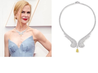 Η Νικόλ Κίντμαν ήταν η πεμπτουσία της haute joaillerie. Κατέπληξε με το μοναδικό yellow-diamond Eagle necklace του οίκου Harry Winston που καταλήγει σε ένα κίτρινο διαμάντι σε σχήμα αχλαδιού 33.42 καρατίων. Σε vintage σχεδιασμό φτερών αετού ξεσήκωσε τα φλας και συνδυάστηκε με σκουλαρίκια, βραχιόλια και δαχτυλίδι επίσης διαμαντένια. Στη συγκεκριμένη ηθοποιό ανήκει και το ρεκόρ των πιο ακριβών κοσμημάτων στα Oscars καθώς το 2015 αυτά που φόρεσε κόστιζαν 7 εκατομμύρια δολάρια.