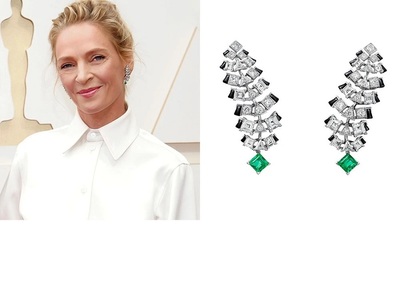 Η πανύψηλη Ούμα Θέρμαν που έκανε μια μίνιμαλ εμφάνιση με λευκό πουκάμισο μας μαγνήτισε με τα υπέροχα Cartier σκουλαρίκια της που «σκαρφάλωναν» στο αυτί.