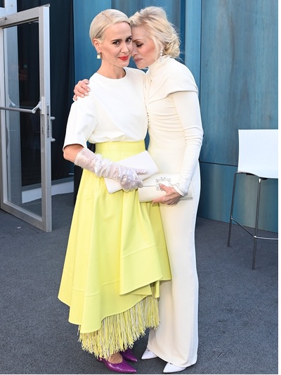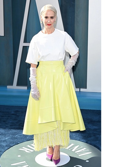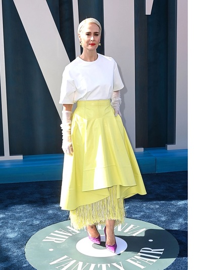Oπτικό κορεσμό σε τουαλέτες και επισημότητες απέφεραν τα βραβεία Οσκαρ, οπότε μια δροσερή εμφάνιση που «φωνάζει» άνοιξη από την ορκισμένη fashionista Σάρα Πόλσον μας ξεσήκωσε με διαφορετικό, πιο οικείο και προσιτό τρόπο. Η πολυβραβευμένη αμερικανίδα ηθοποιός που έχει αγαπηθεί μέσα από τα σήριαλ American Crime Story και American Horror Story, ενώ πρόσφατα υποδύθηκε στο Netflix την εφιαλτική νοσοκόμα της ρετρό σειράς Ratched, προσέγγισε διαφορετικά το κάλεσμα στο περίφημο after party του Vanity Fair. Επένδυσε στη δύναμη των λαμπερών χρωμάτων και ειδικά στο κίτρινο, επικροτώντας μια από τις κορυφαίες εαρινές τάσεις. Επίσης έκανε color blocking συνδυάζοντας το κίτρινο με μονοχρωμίες σε λευκό και μοβ. Statement κομμάτι του outfit μια μαγευτική φούστα σε κλος γραμμή, με παιχνιδιάρικη ασυμμετρία και εσωτερικά φτερά της νέας εποχής του οίκου Bottega Veneta. Πρόκειται για κομμάτι της νέας συλλογής για τον επόμενο χειμώνα με την υπογραφή του καινούριου creative director Mathieu Blazy. O 35χρονος Βέλγος που έχει θητεύσει σε Celine και Calvin Klein κέντρισε αμέσως τη star που θεωρείται μια από τις πλέον καλοντυμένες και trendy της Αμερικής και πάντα θαυμάζουμε ό,τι φοράει. Η εν λόγω φούστα μας τρέλανε με απλό oversized τι-σερτ, μακριά γάντια και γοβάκια. Ένα styling που εύκολα υιοθετείται από κάθε γυναίκα με μια ιδιαίτερη, πλούσια φούστα. Στα 47 της χρόνια, η Πόλσον είναι κατά το Time μια από τις πιο επιδραστικές προσωπικότητες διεθνώς. Δηλώνει αμφισεξουαλική και πολύ ερωτευμένη με την 79χρονη ηθοποιό Τέιλορ Χόλαντ, ζουν μαζί την τελευταία επταετία.