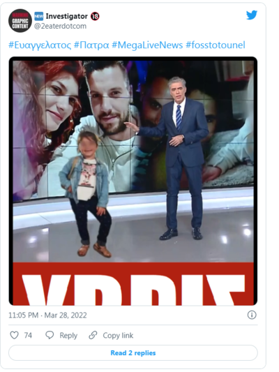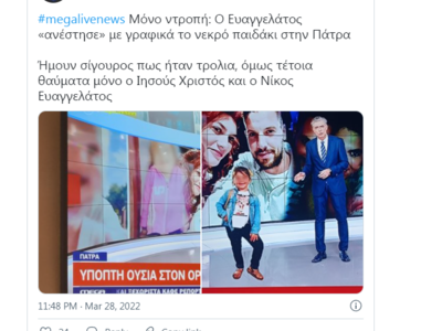 Με το ολόγραμμα της νεκρής 9χρονης Τζωρτζίνας δίπλα του -ενός από τα τρία παιδιά της οικογένειας Δασκαλάκη που πέθαναν στην Πάτρα- εμφανίστηκε ο Νίκος Ευαγγελάτος στην εκπομπή του Live News, τη Δευτέρα 28 Μαρτίου, στο Mega, προκαλώντας οργή στα social media.