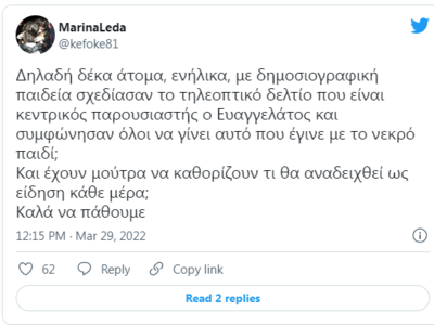"Δηλαδή δέκα άτομα, ενήλικα, με δημοσιογραφική παιδεία σχεδίασαν το τηλεοπτικό δελτίο που είναι κεντρικός παρουσιαστής ο Ευαγγελάτος και συμφώνησαν όλοι να γίνει αυτό που έγινε με το νεκρό παιδί; Και έχουν μούτρα να καθορίζουν τι θα αναδειχθεί ως είδηση κάθε μέρα; Καλά να πάθουμε" είναι ένα από τα σχόλια που προκάλεσε αυτή η εμφάνιση του Νίκου Ευαγγελάτου, ενώ ορισμένοι το χαρακτήρισαν "ύβρι".