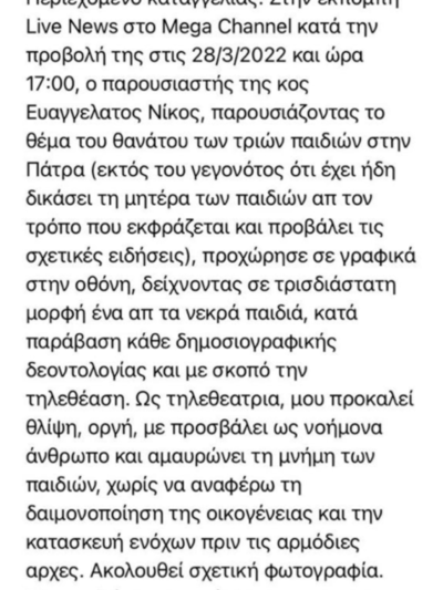 Το avgi.gr αναφέρει ότι κατατέθηκε και καταγγελία στο ΕΣΡ. Στην καταγγελία, ζητείται η παρέμβαση του ΕΣΡ. "Ως τηλεθεάτρια, μου προκαλεί θλίψη, οργή, με προσβάλλει ως νοήμονα άνθρωπο και αμαυρώνει τη μνήμη των παιδιών, χωρίς να αναφέρω τη δαιμονοποίηση της οικογένειας και την κατασκευή ενόχων πριν τις αρμόδιες αρχές" αναφέρει η καταγγελία.