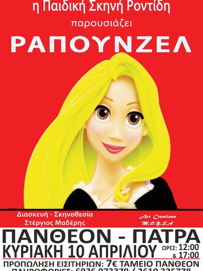 Η Παιδική Σκηνή Ροντίδη πρόκειται να παρουσιάσει την παράσταση «Ραπουνζέλ» στο θέατρο Πάνθεον στη Δημ. Γούναρη και Κανακάρη στην Πάτρα αυτή την Κυριακή 10 Απριλίου 2022.