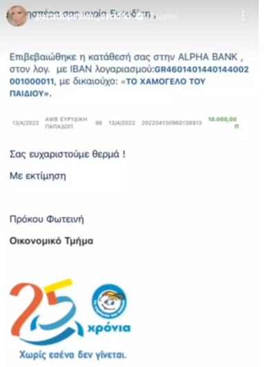 Πιο συγκεκριμένα, η Ευρυδίκη δώρισε το σημαντικό ποσό των 10.000 ευρώ.