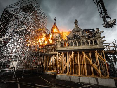 «Το κτίριο δεν ήταν προσιτό για καιρό, εξαιτίας του τοξικού μόλυβδου και λόγω του κινδύνου κατάρρευσης. Σε κάθε περίπτωση, έπρεπε να γεμίσουμε το κτίριο με καπνό, να καλύψουμε το πάτωμα με σκόνη και στάχτη, να τοποθετήσουμε τόνους με φλεγόμενο ξύλο και να πλημμυρήσουμε τις πλάκες. Χτίσαμε ένα αντίγραφο. Οι φλόγες έβγαιναν από εκατοντάδες ακροφύσια που έβαλαν φωτιά στο σκηνικό. Ξαναχτίσαμε το κεντρικό κλίτος, τα εξωτερικά υπερώα και τα δοκάρια της βόρειας πτέρυγας, καθώς και το εσωτερικό του τεράστιου καμπαναριού στην τελική σκηνή. Εν ολίγοις, όλα τα εμβληματικά μέρη του καθεδρικού της Παναγίας των Παρισίων πλήγηκαν από την καταστροφή και αυτό έπρεπε να φανεί πριν και μετά τη φωτιά».