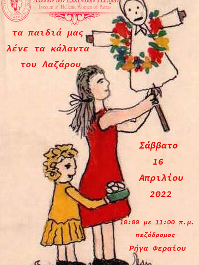 Το Σάββατο16 Απριλίου 2022 οι μικροί μαθητές και μαθήτριες του Λυκείου των Ελληνίδων Πατρών αναβιώνουν ένα έθιμο που τείνει να ξεχαστεί. Κρατώντας τον στολισμένο "Λάζαρο" και καλάθια με λουλούδια και “Λαζαράκια” θα ψάλουν τα "Λαζαρικά", τα παραδοσιακά κάλαντα της ημέρας.