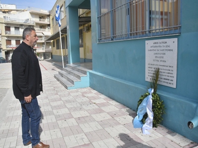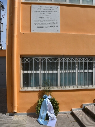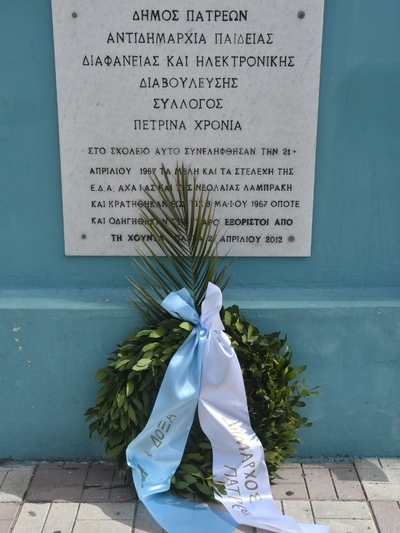 Ο Δήμαρχος Πατρέων Κώστας Πελετίδης και ο Αντιδήμαρχος Παιδείας και Αθλητισμού, Τάκης Πετρόπουλος κατέθεσαν στεφάνια στις μαρμάρινες πλάκες – μνημεία, που έχουν τοποθετηθεί από το Δήμο, στα δύο σχολεία, προς τιμή των αγωνιστών του αντιδικτατορικού αγώνα.