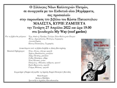 Ο Σύλλογος Νέων Καλλιτεχνών Πατρών, σε συνεργασία με τον Εκδοτικό οίκο 24 Γράμματα, διοργανώνουν την παρουσίαση του βιβλίου του Κώστα Παπασπήλιου "ΜΑΛΙΣΤΑ, ΚΥΡΙΕ ΖΑΜΠΕΤΑ"την Τετάρτη 27 Απριλίου 2022 και ώρα 19.00, στο ξενοδοχείo My Way (roof garden)