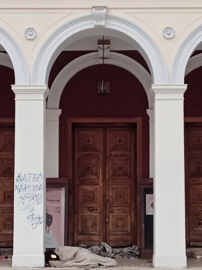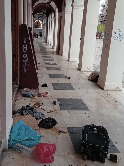 Άθλια η εικόνα μπροστά από το δημοτικό θέατρο Απόλλων της Πάτρας. Ένας άστεγος κοιμάται στα σκαλιά του θεάτρου και ο χώρος γύρω του είναι γεμάτος σκουπίδια. Τις εικόνες τράβηξε την Δευτέρα το απόγευμα, ο συμπολίτης Οδυσσέας Ξεριζωτής.