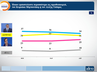 Στην ερώτηση «ποιον εμπιστεύεστε περισσότερο ως πρωθυπουργό, τον Κυριάκο Μητσοτάκη ή τον Αλέξη Τσίπρα;» το 34% επιλέγει τον Πρωθυπουργό (36% το αντίστοιχο ποσοστό στη δημοσκόπηση του Μαρτίου) ενώ 25% απαντά ότι προτιμά τον επικεφαλής της αξιωματικής αντιπολίτευσης (23% το ποσοστό στην προηγούμενη μέτρηση). 31% απαντά «κανέναν από τους δύο».