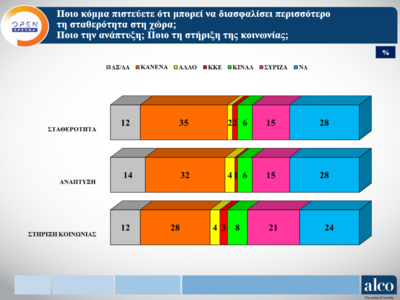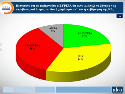 Σε ό,τι αφορά το αν ο ΣΥΡΙΖΑ θα αντιμετώπιζε το ζήτημα της ακρίβειας καλύτερα ή χειρότερα, το 35% λέει ότι θα ήταν χειρότερα, το 34% ίδια και το 22% «καλύτερα».